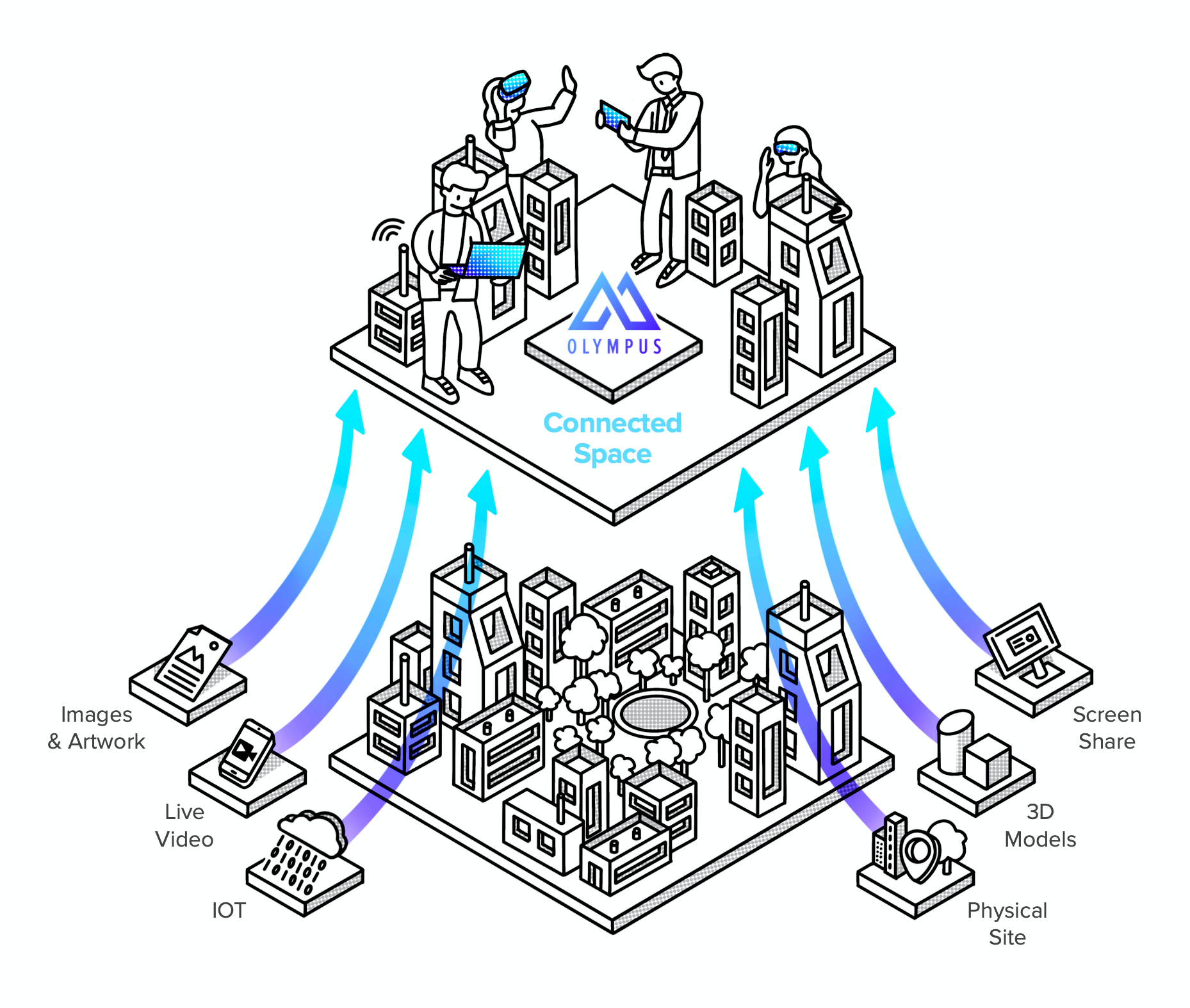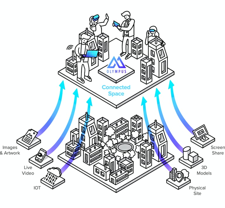 Diagram created to illustrate how real-world data inputs (IoT, 3D, Video, etc.) flow into a shared virtual environment.